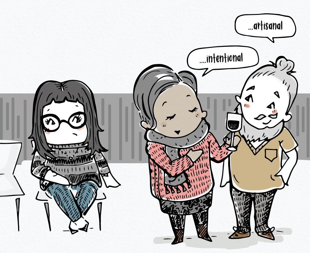 Arriving early is never a good idea if you’re shy and attending an event alone. I sat in a chair, staring forward, painfully self-conscious at knowing no one. Birkenstocks, man-buns, and beautifully woven scarves sailed into the room*. As each group entered, they greeted different groups, catching up with other members of the “community”. “And of course, you must know…!” they cried. I was surrounded by vocal fry, knowing nods -- as terrifying and exclusive as the posh elite they eschew.